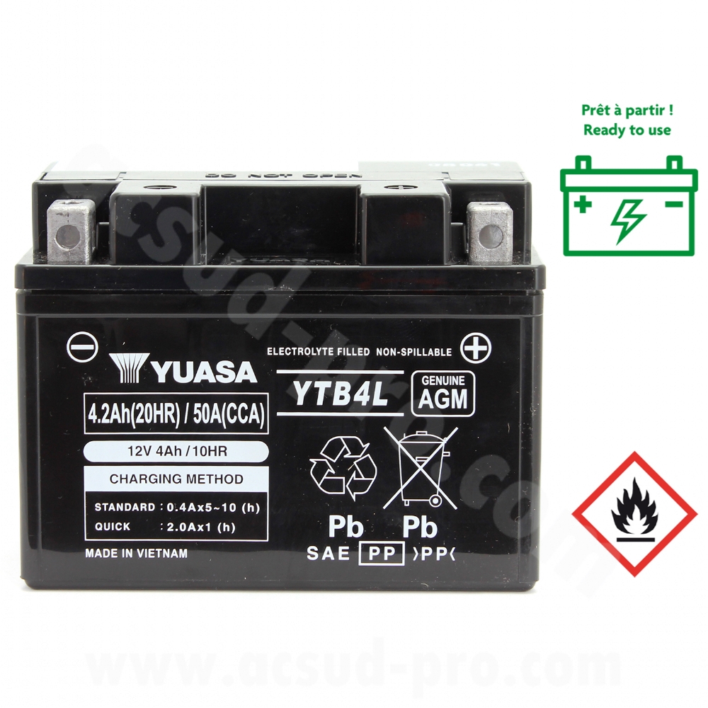 Batterie Yuasa YB4L-B 12V-4A Livré sans acide pour scooters 50cc